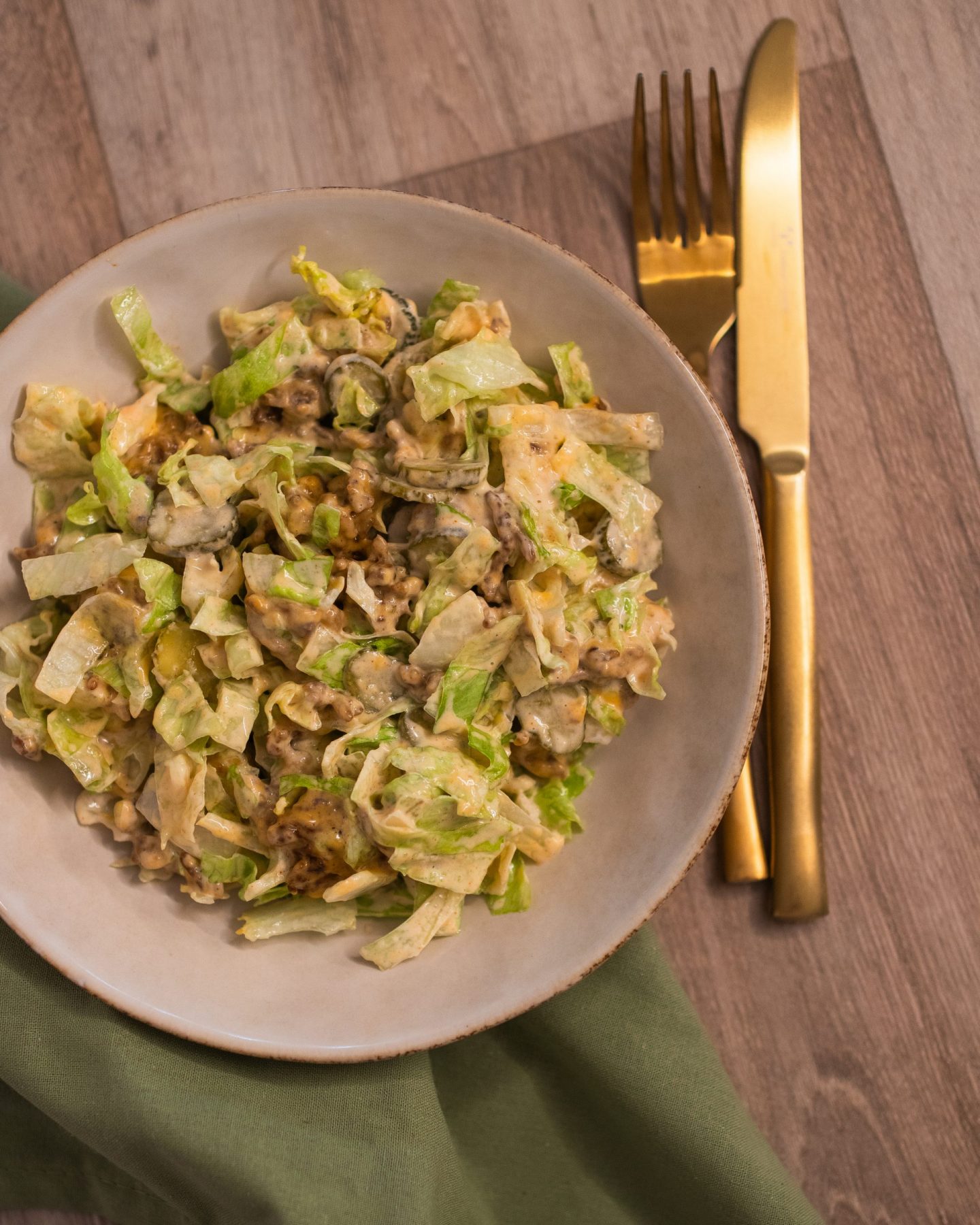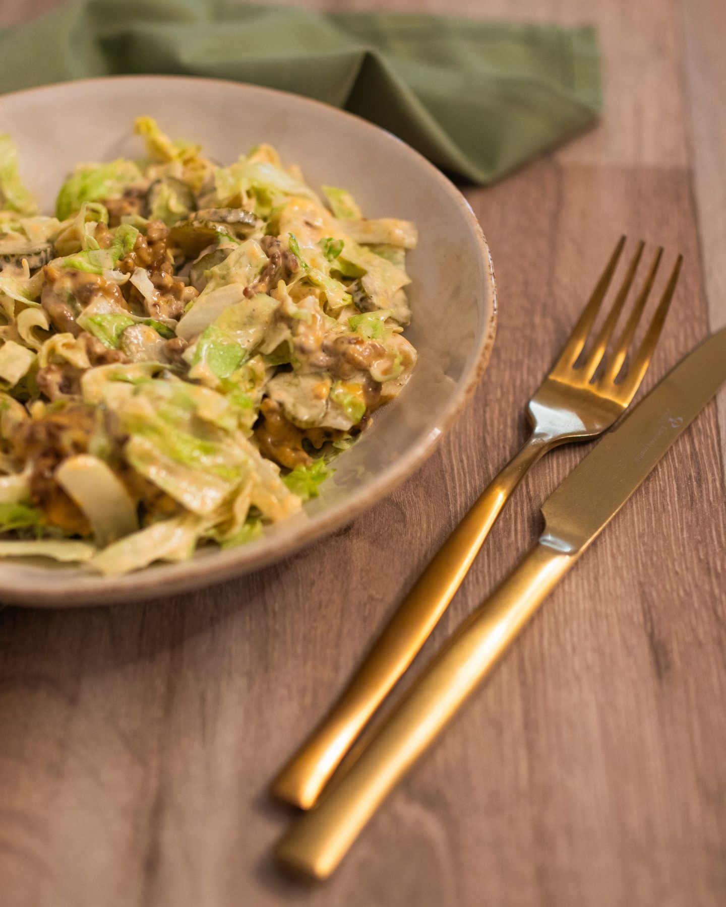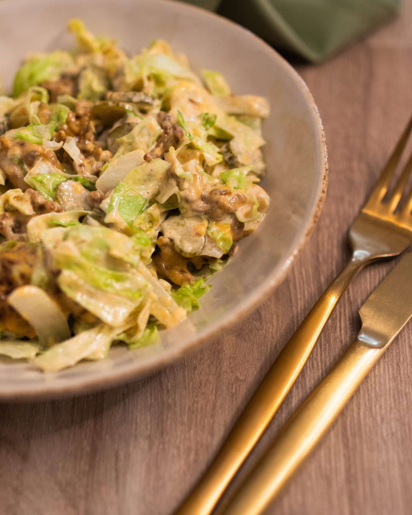Gerade abends kann es dem Körper guttun, auf große Mengen Kohlenhydrate zu verzichten. Viele Menschen fühlen sich nach sehr kohlenhydratreichen Mahlzeiten träge, aufgebläht oder schlafen schlechter. Ein Low-Carb-Abendessen wie dieser Big Mac Salat liefert viel Eiweiß und Fett, was lange satt macht, ohne schwer im Magen zu liegen.