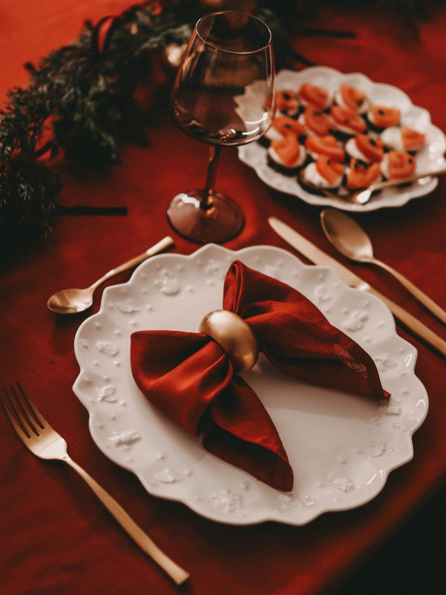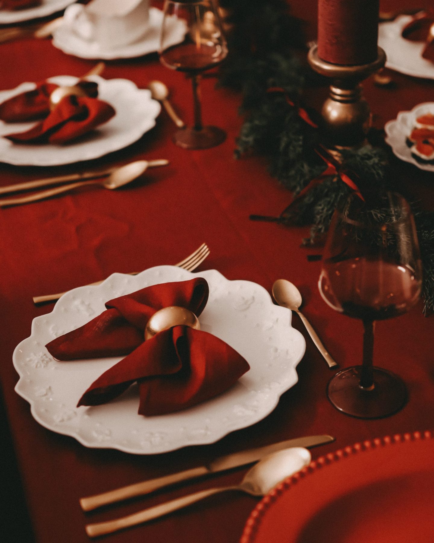 In meiner Tischgestaltung habe ich bewusst ein tiefes, warmes Rot gewählt, das sowohl elegant als auch gemütlich wirkt. Diese Farbe harmoniert wunderbar mit Gold und sorgt dafür, dass der Tisch sofort wie ein festlicher Mittelpunkt des Raumes erscheint.