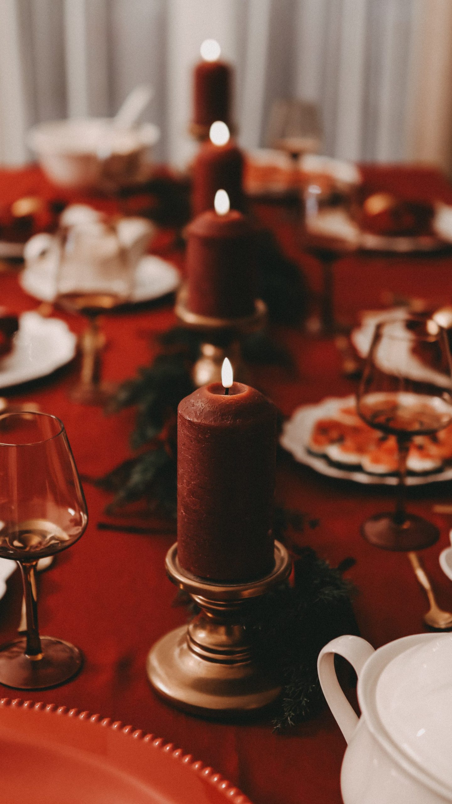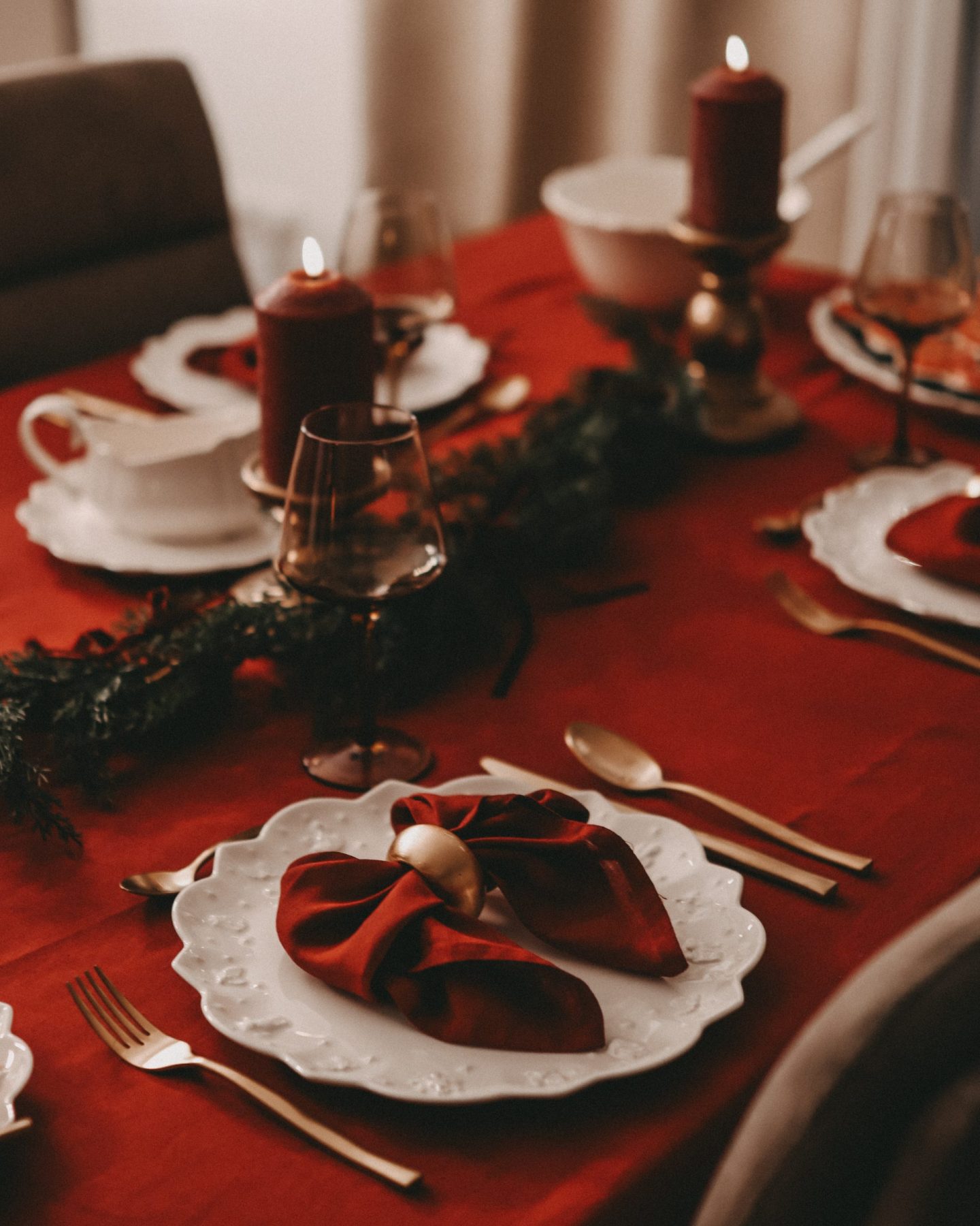 Was wäre ein weihnachtlicher Tisch ohne Kerzenschein? Die dicken roten Stumpenkerzen auf goldenen Haltern waren ein zentrales Element meiner Dekoration. Das warme Licht sorgt nicht nur für Behaglichkeit, sondern betont auch die goldenen Details und lässt das Rot der Tischdecke samtig erscheinen.