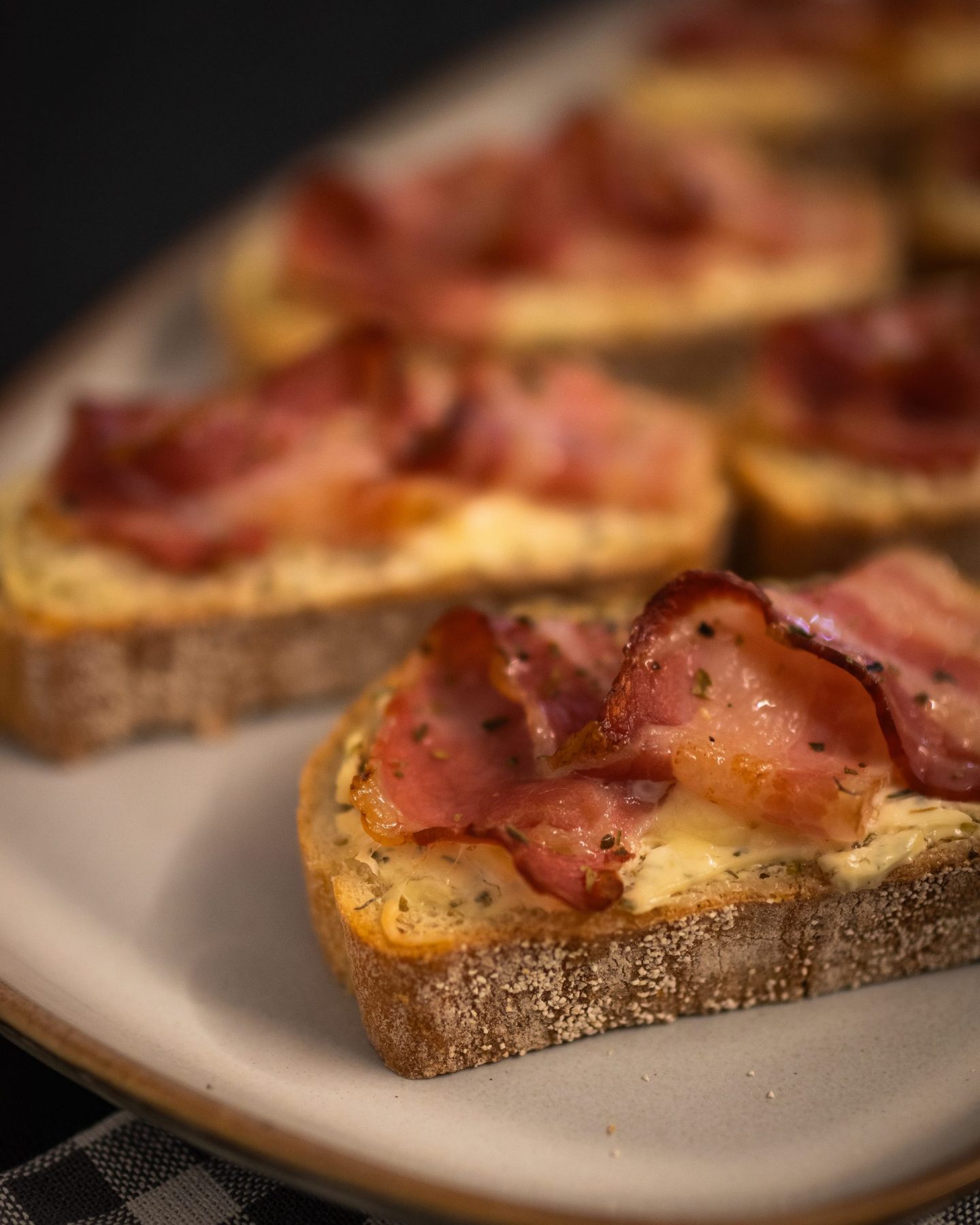- Backe die Ciabatta-Stücke für ca. 15 Minuten, bis der Käse geschmolzen und leicht gebräunt ist und der Bacon knusprig wird.