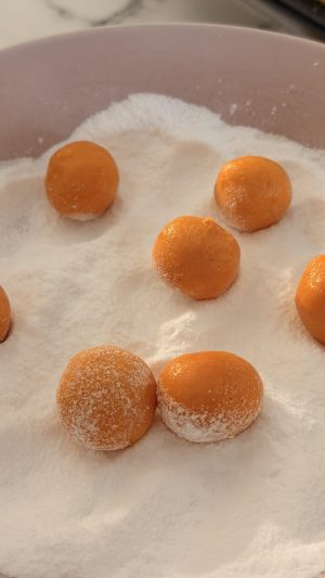 - Die Teigportionen zu Kugeln formen – so bleibt nichts kleben und alles geht viel leichter.