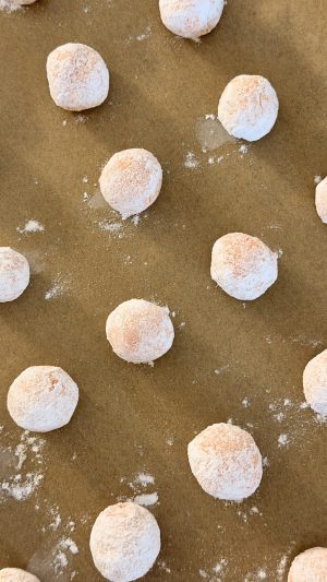 - Die Kugeln auf ein mit Backpapier belegtes Blech legen (etwa 30 Stück pro Blech) und bei 190°C Ober-/Unterhitze für etwa 12 Minuten backen. (Erst ein Blech, dann das andere) Danach kurz abkühlen lassen und genießen.