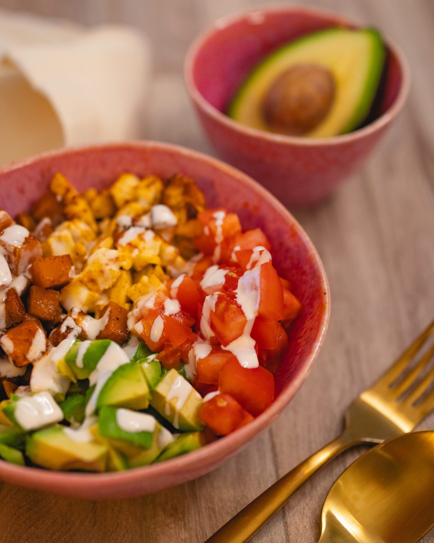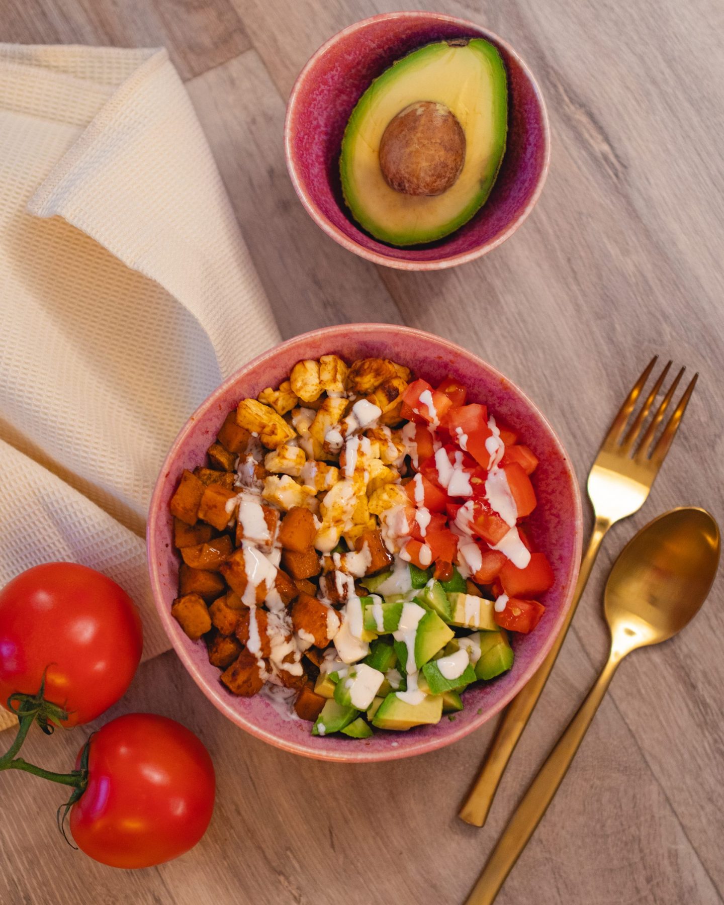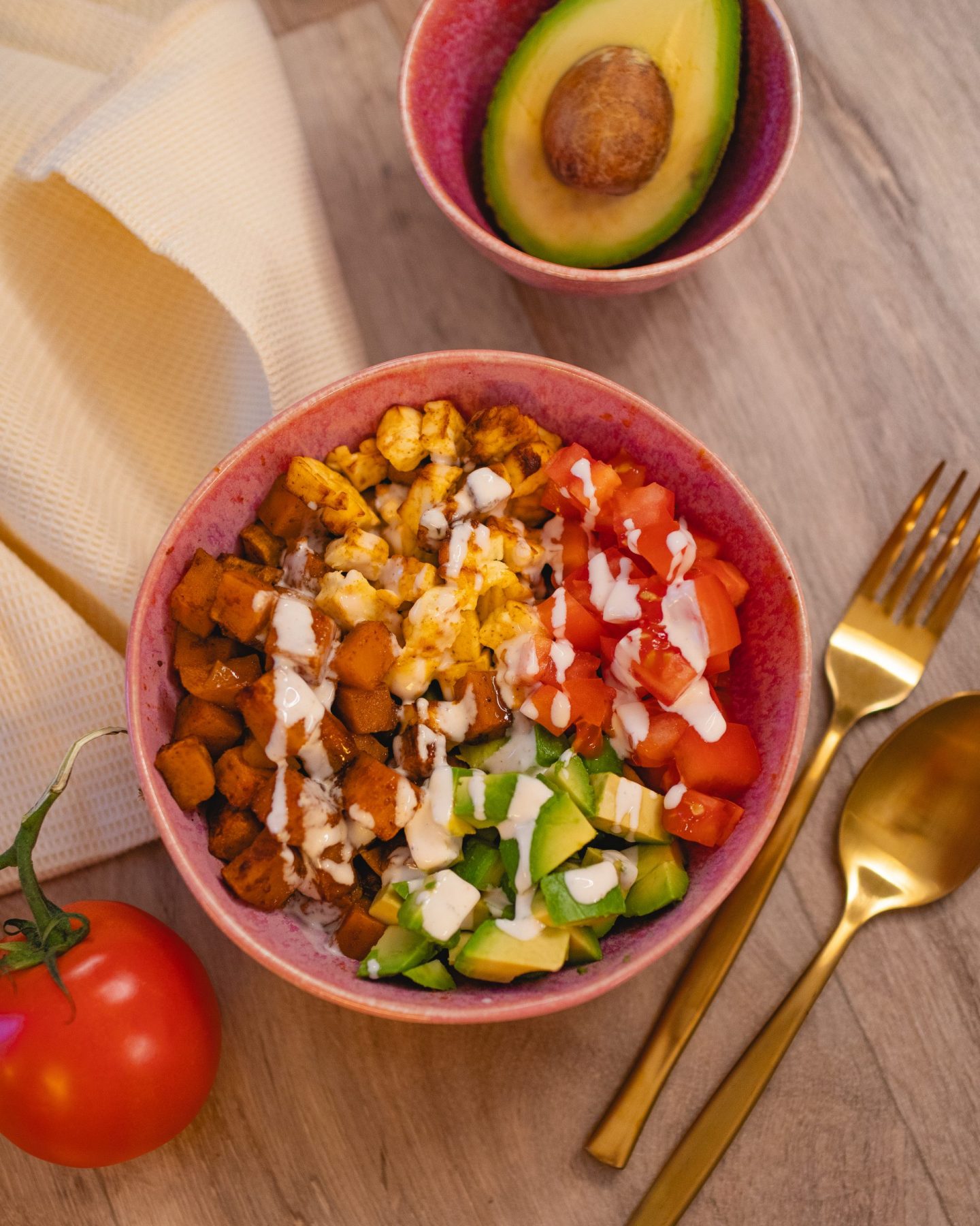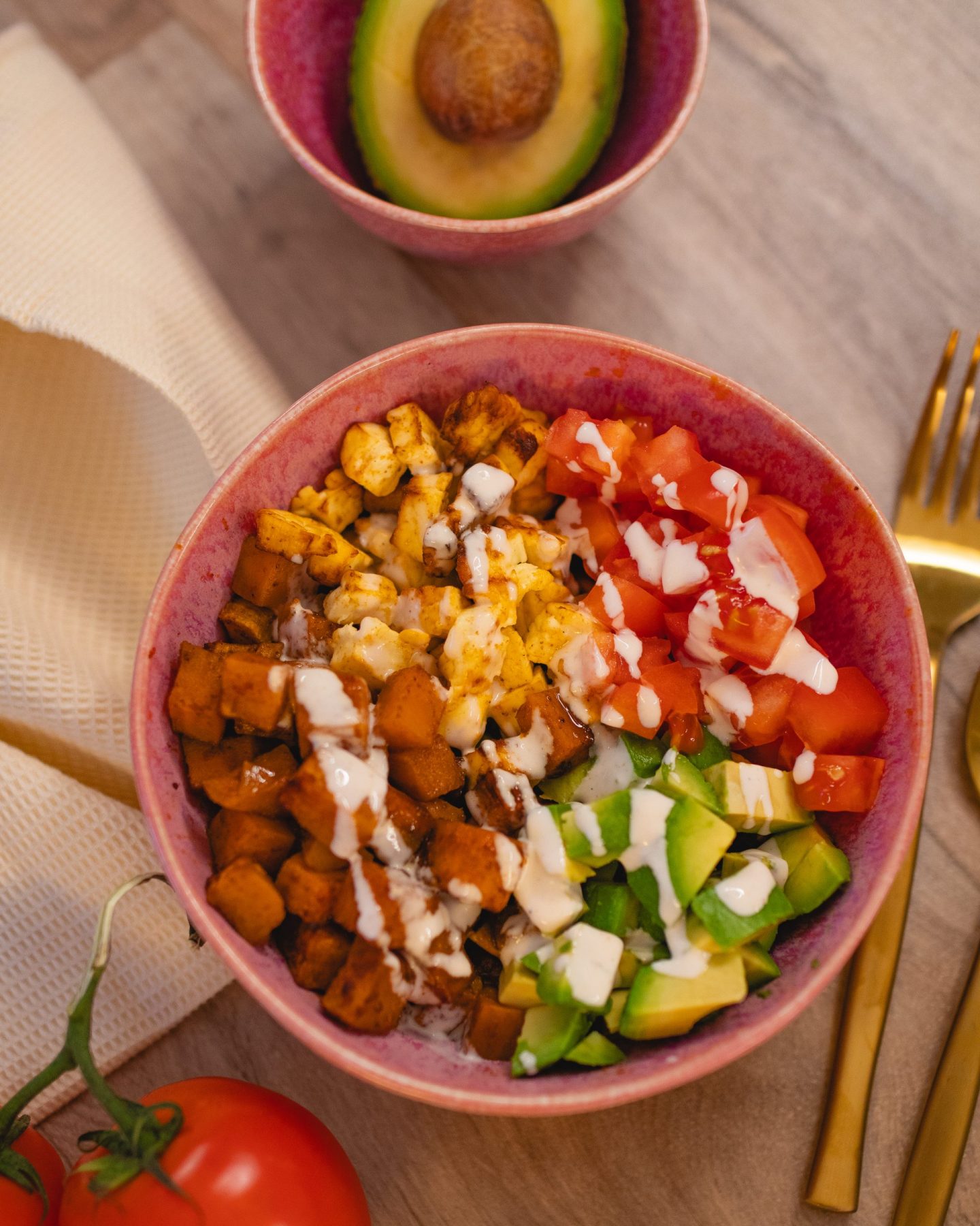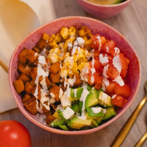 Die Basis bilden ofengeröstete Süßkartoffeln, außen leicht gebräunt und innen wunderbar weich. Ihr leicht süßlicher Geschmack passt perfekt zu würzigem Hirtenkäse, frischen Tomaten und cremiger Avocado. Ohne Salat, dafür mit klaren, ehrlichen Zutaten, die für sich sprechen. Diese Bowl lebt von der Kombination aus warm und kalt, weich und cremig, süß und herzhaft – genau das macht sie so besonders.