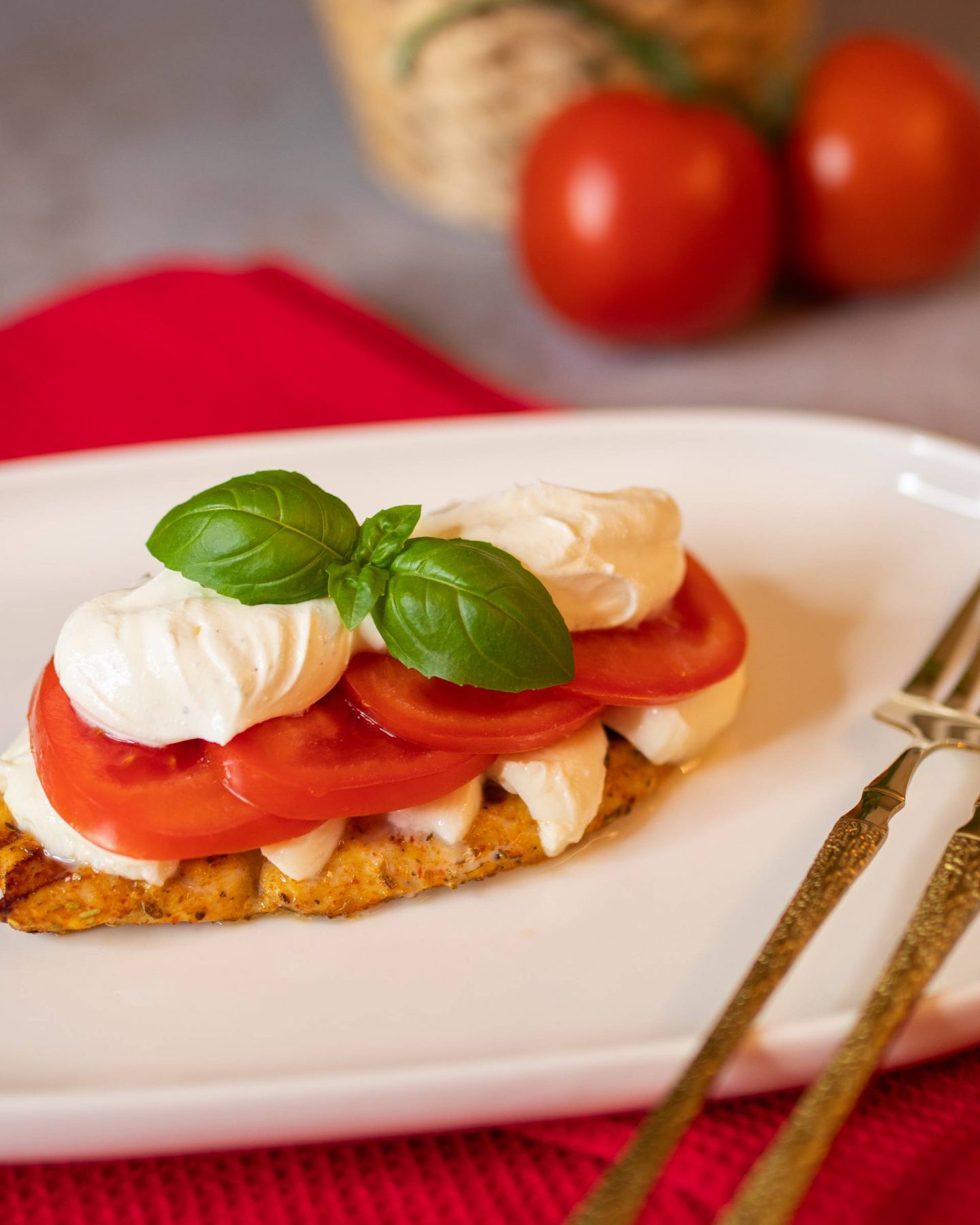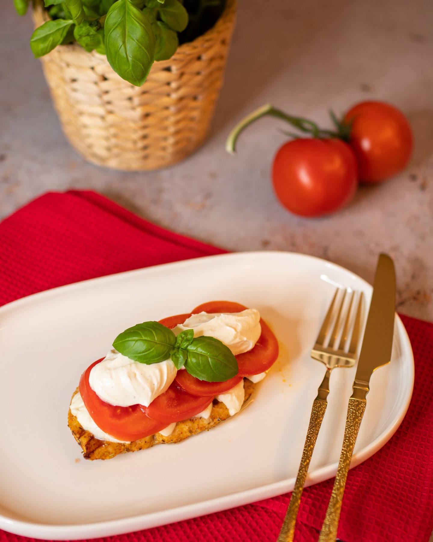 Würziges Pfannenhähnchen mit Mozzarella-Tomaten-Topping (Low Carb)
